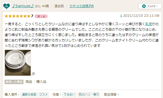 乍一看,明明是厚实的乳霜质地,但涂抹起来延展性非常好,薄薄地像乳液一样,是一款亲肌且带点光泽质感的乳霜。最近比较在意眼下的细纹,这款面霜涂开之后,感觉细纹没以前那么明显了。以前早上起来的时候,因为晚上涂的面霜没有及时保湿,结果脸上有了皱纹,导致我从早上开始心情就不好,但自从用这个面霜代替了以前的晚霜之后,能保湿一整晚,第二天也能心情很好地开始新的一天。
