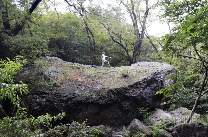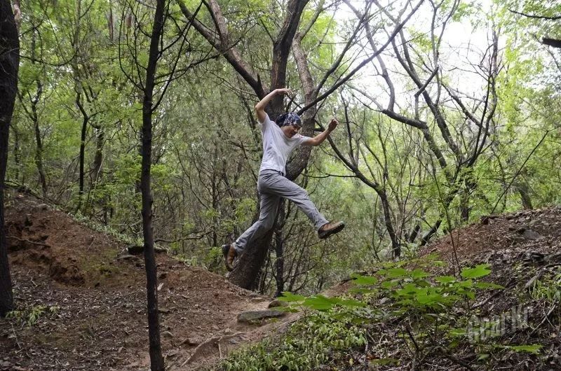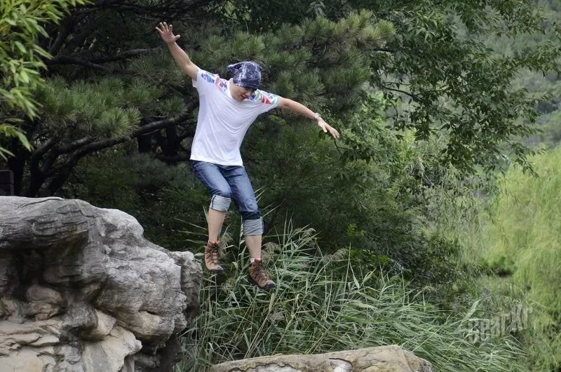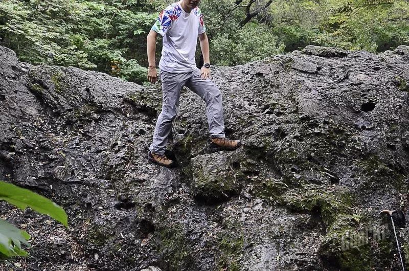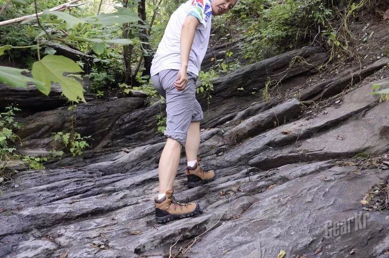 试了一下攀登石壁,没有保护措施,上升也就一米多高。无论是将重心放在脚尖或者外脚背,只要石头不松动,鞋子就会比较稳定,鞋头鞋跟的保护覆盖层,能够保证的脚不被无意碰伤。鞋的表面皮质也不算硬,能够做出较大角度的翻折、蹬踏等动作。