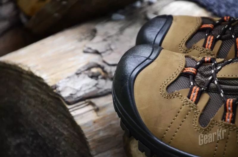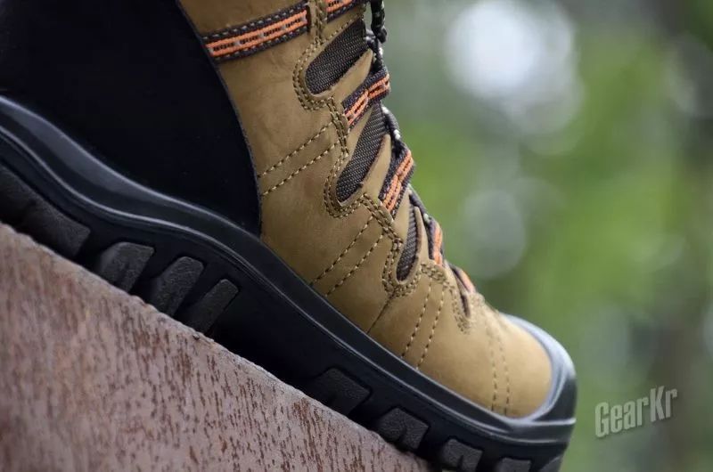 大面积包裹的防踢橡胶鞋头,这是登山鞋的标配了,好处就不多说了,出去爬一次野山就知道了。鞋头与皮面包覆衔接较紧,借助鞋底的厚度,无意踢到石块也不会碰伤。