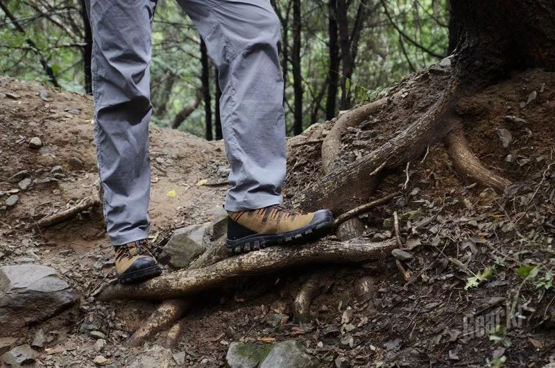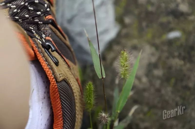 鞋子整体包裹性很好,在不容易发力的松软土质坡面,可以感受到鞋帮对脚一侧的挤压,能够吃住劲,特别是踝关节被软性领口包覆固定,不会轻易崴脚。