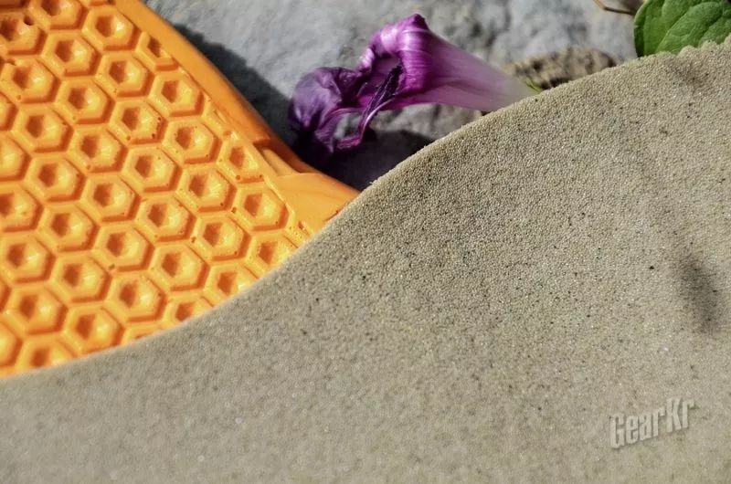 上层鞋垫类似EVA发泡材质,脚掌部位有3行小孔,提高通风透气效果。鞋垫底部呈六边形蜂窝状,这也是比较稳定的结构,避免鞋垫在长途跋涉后的扭曲。