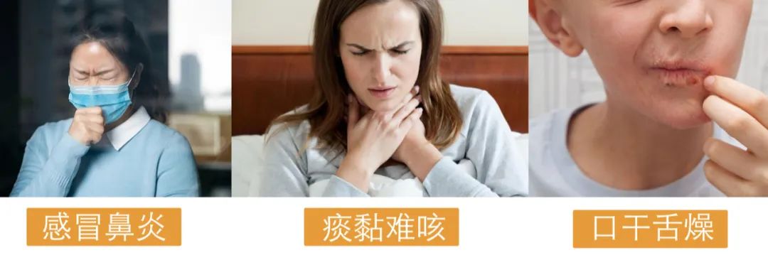 秋冬干燥,易耗伤津液。口干舌燥、大便干、唇部干裂、皮肤干。