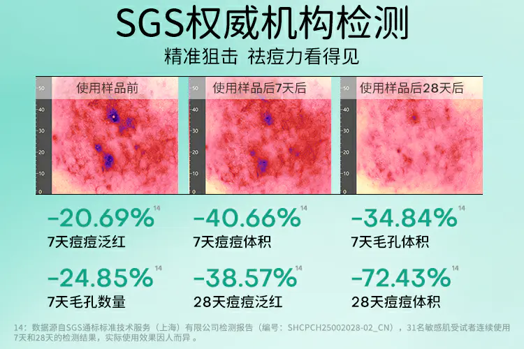 (2)使用7天痘痘泛红-20.69%,毛孔体积-34.84% 毛孔数量-24.85