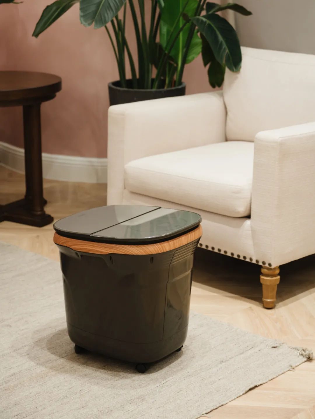 接水倒水也挺方便,它的万向轮挺顺滑,很好推。我挑泡脚桶比较注重这点,轮子不好推的话不但容易刮花地板,还有可能边走边洒水。
