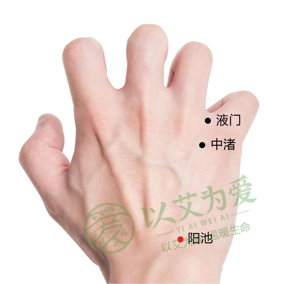 艾灸方法:取合适体位,灸准阳池、三焦俞30-40分钟,灸至局部皮肤温热潮红为宜。每日或隔日1次,10次为一个疗程。