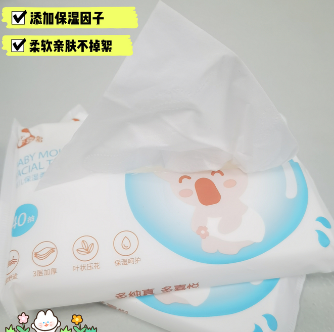 超级柔软的纸巾,添加+保湿因子,3层柔韧,不掉絮