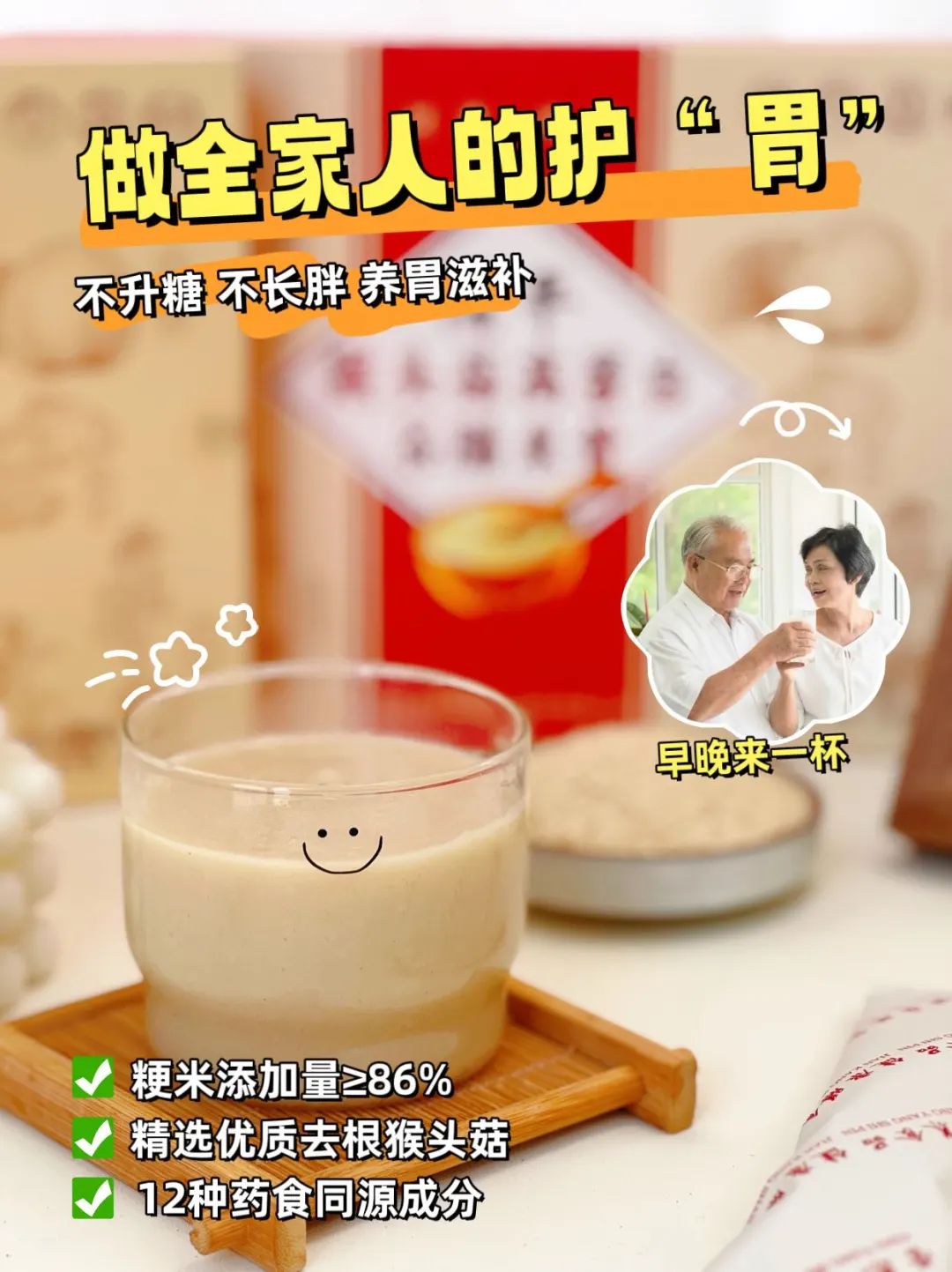 富含猴头菇、大豆蛋白、燕麦、藜麦等多种营养成分,高蛋白、低脂肪、零胆固醇,养胃护胃,增强体质,特别适合肠胃不适人群、健身人群、素食人群食用。