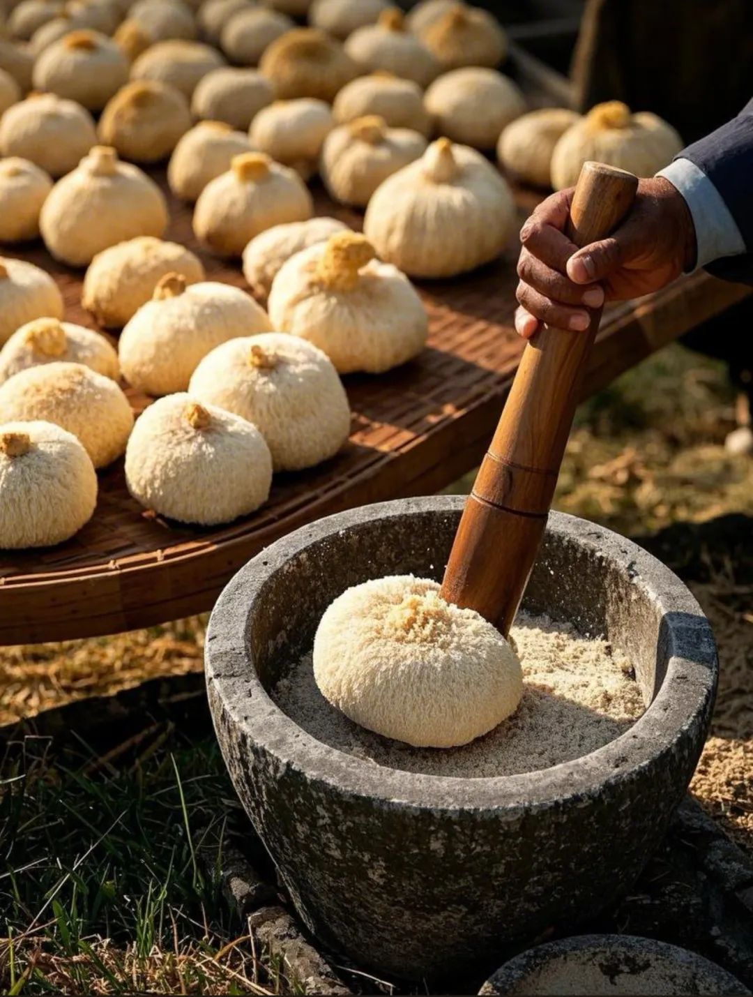 去除根部,只选用品质上乘的菌冠部分,经过自然晾晒和高温杀菌后,进行打粉,