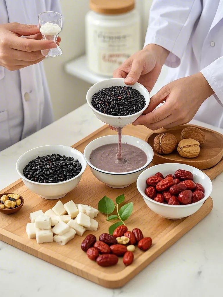精选八种珍贵食材:黑米、黑豆、黑芝麻、核桃、枸杞、红枣、山药、芡实,