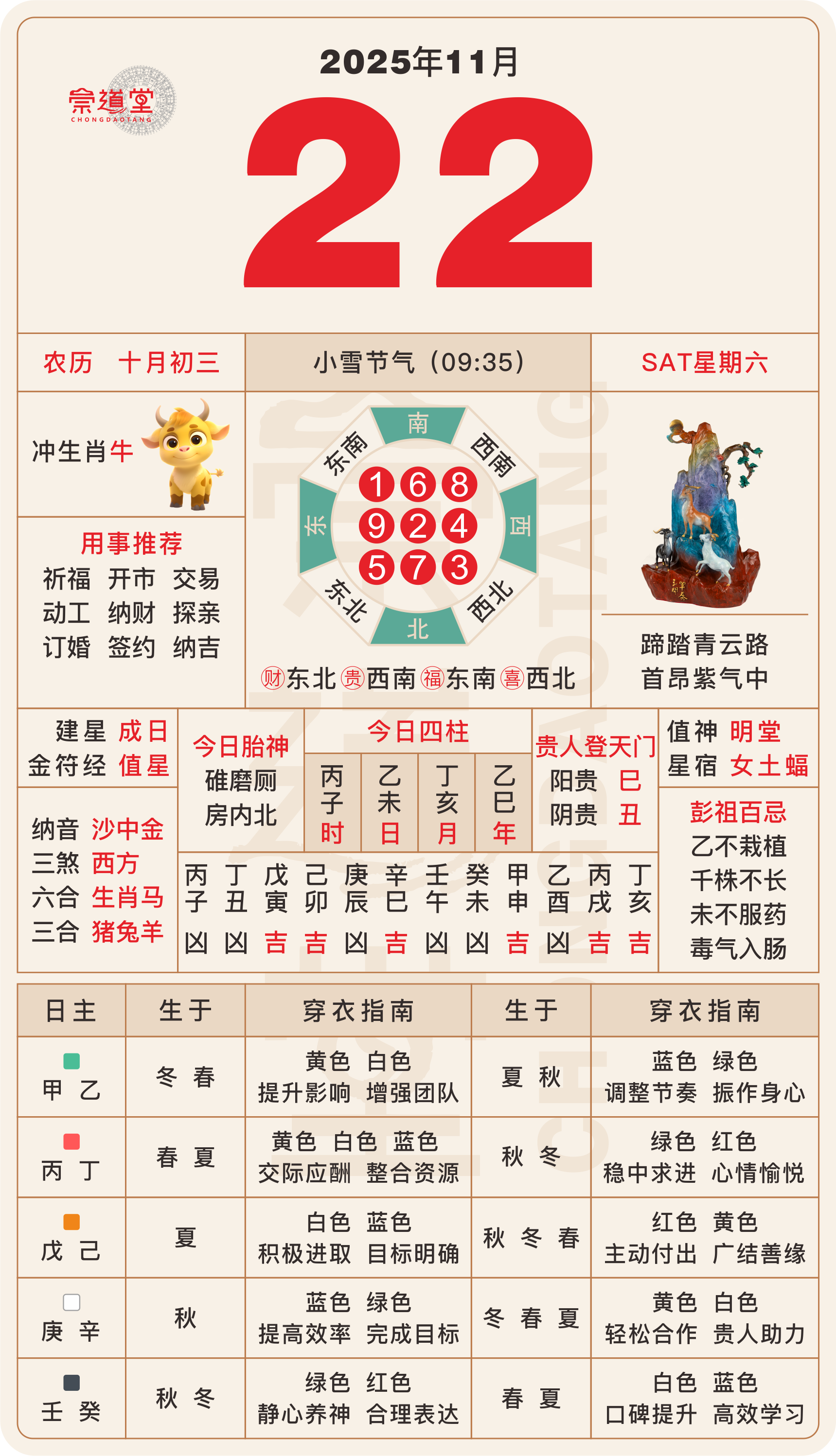 己丑、戊子、戊戌、庚子、庚戌、辛丑等日主,今日宜静不宜动,建议静坐冥想、焚香抄经,尽量心平气和。