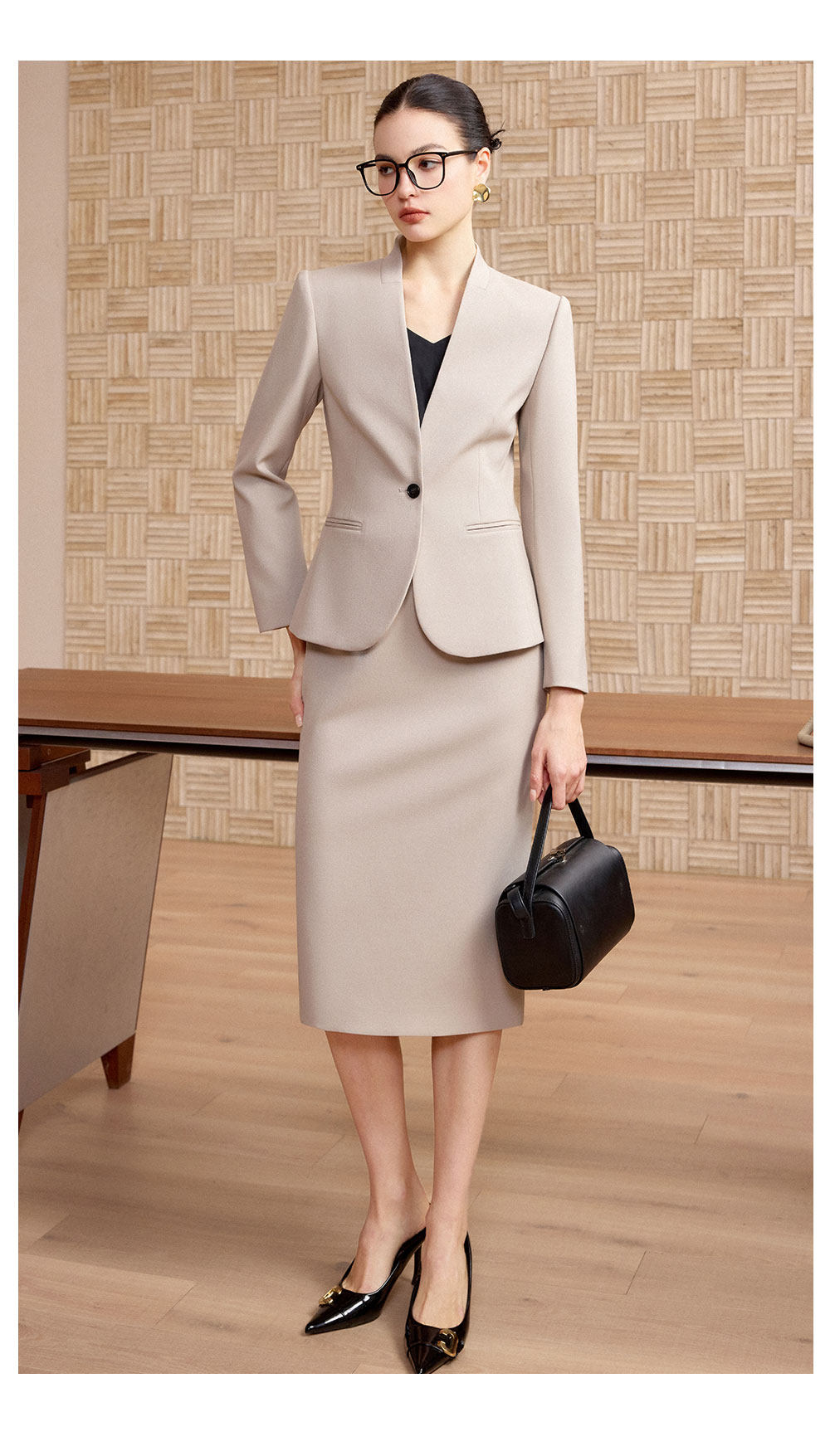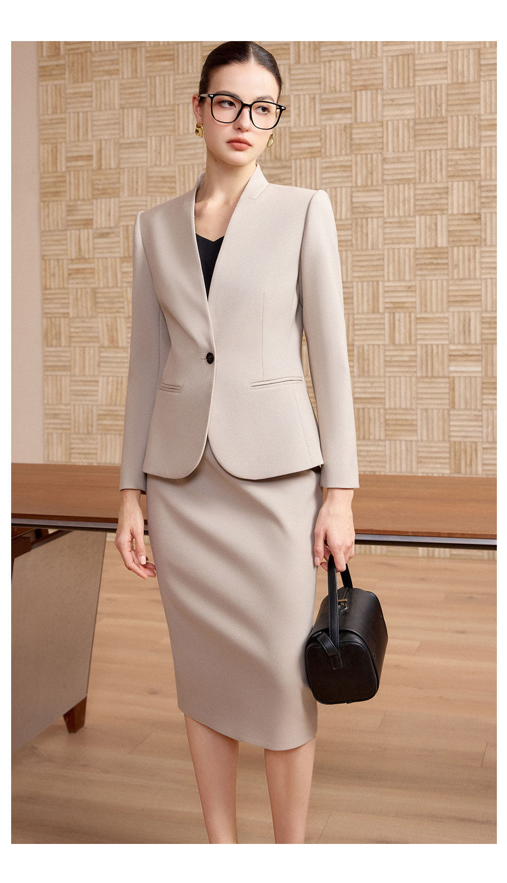 浅杏色西装套裙,是通勤衣橱里的温柔答案。无领设计利落又不失柔和,单粒扣收腰版型,精准勾勒出干练线条,让专业感与优雅感自然共生。