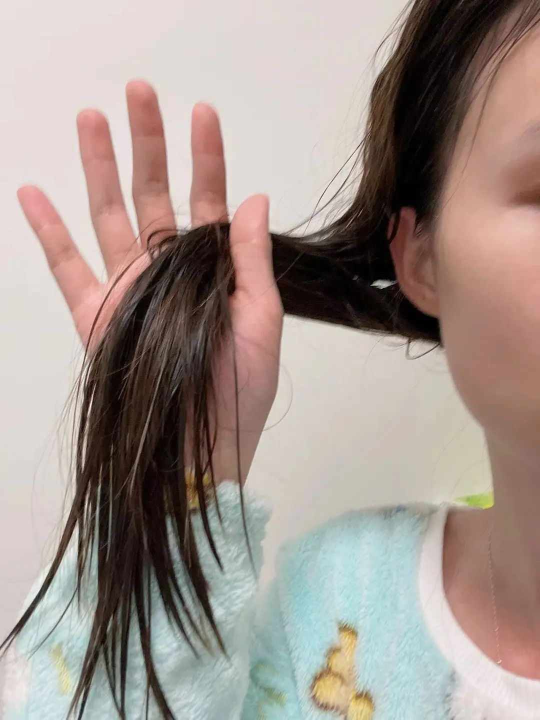 吸水程度有多强呢?小珍妮有次忘记拿干发帽,洗完头后用它包了一下头发,稍微按压了几下,头发就不会再滴水了,吹头发时都不会有冷冷的水珠在脸上胡乱地拍,比干发帽还厉害!看看被浴巾包过后的干发效果▼