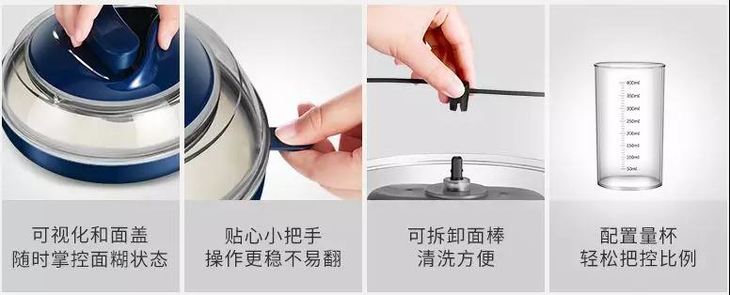 买薄饼机就会有一体式和面盘、量杯送,轻松调配份量,粉浆均匀细腻,搅拌棒、上盖组件都会配套的!