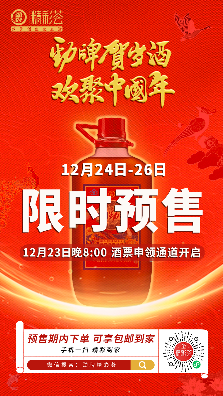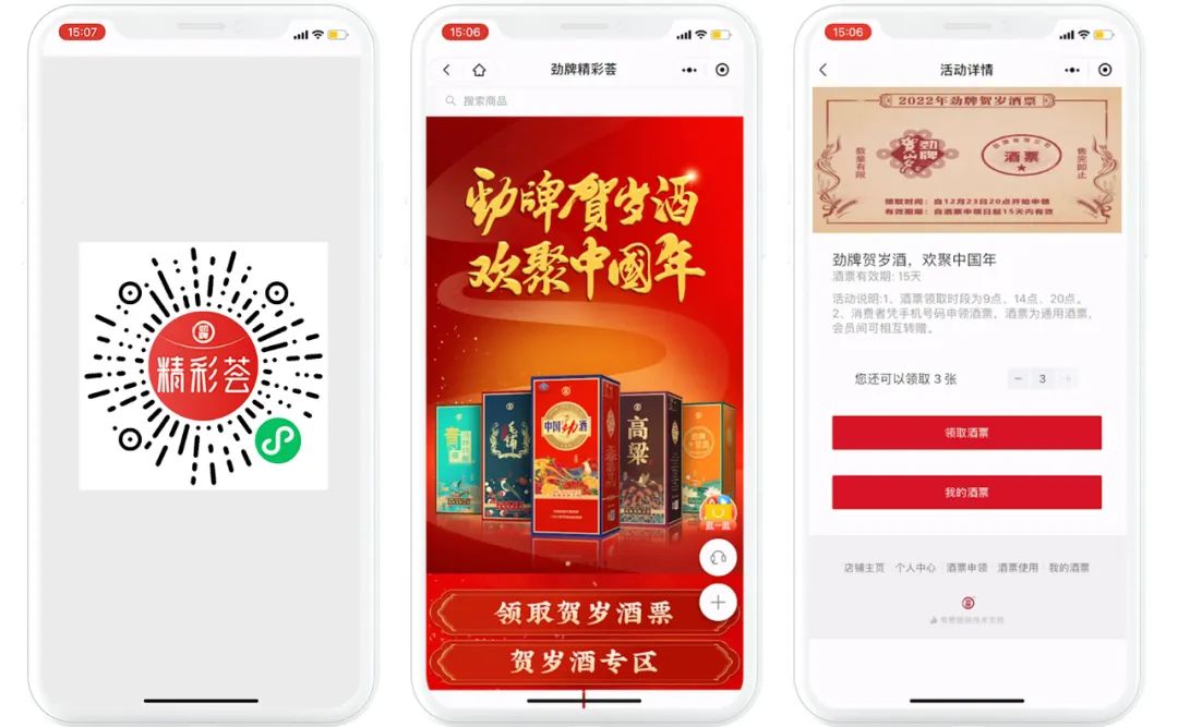 操作步骤:①微信扫码【劲牌精彩荟】——②进入贺岁酒专区,点击“领取贺岁酒票”——③选择需领取酒票的数量,点击 “领取酒票”即可。