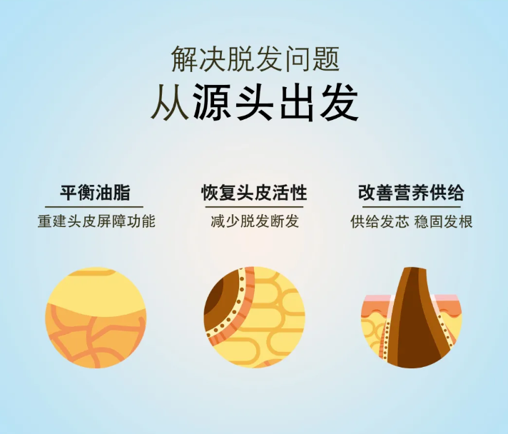 从源头出发,清洁隐藏的头皮油脂污垢的能力,补充幼弱发质养分,激活毛囊细胞促进头发健康生长,使后续营养更易吸收 。