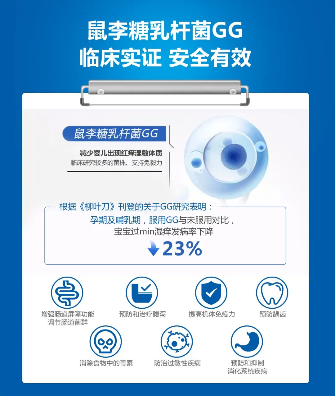 ① 促进肠道健康:鼠李糖乳杆菌LGG耐胃酸、胆盐的特性使得它可以活体进入肠道,实现安全定植,依附于肠道脾细胞形成一层保护屏障,从而保护肠道健康。并且定制以后可以调节宿主肠道微生态,促进菌群平衡。
