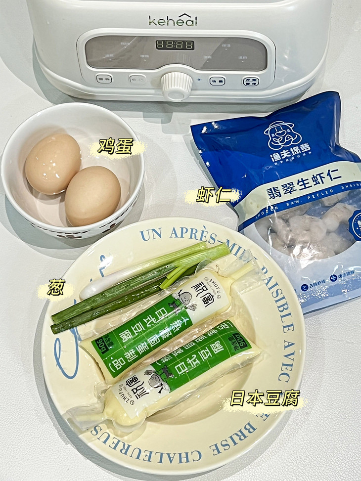 1、豆腐切片,虾仁洗净备用,香葱洗净切葱花