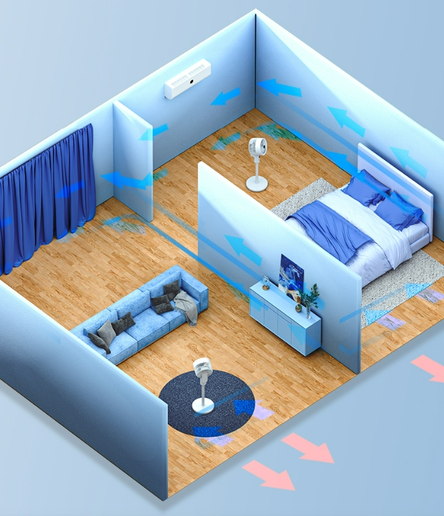 打开风扇后,可以将沉淀的冷气自上而下充分循环,空调冷气就能很快散布到整个房间,达到平衡室温的作用。