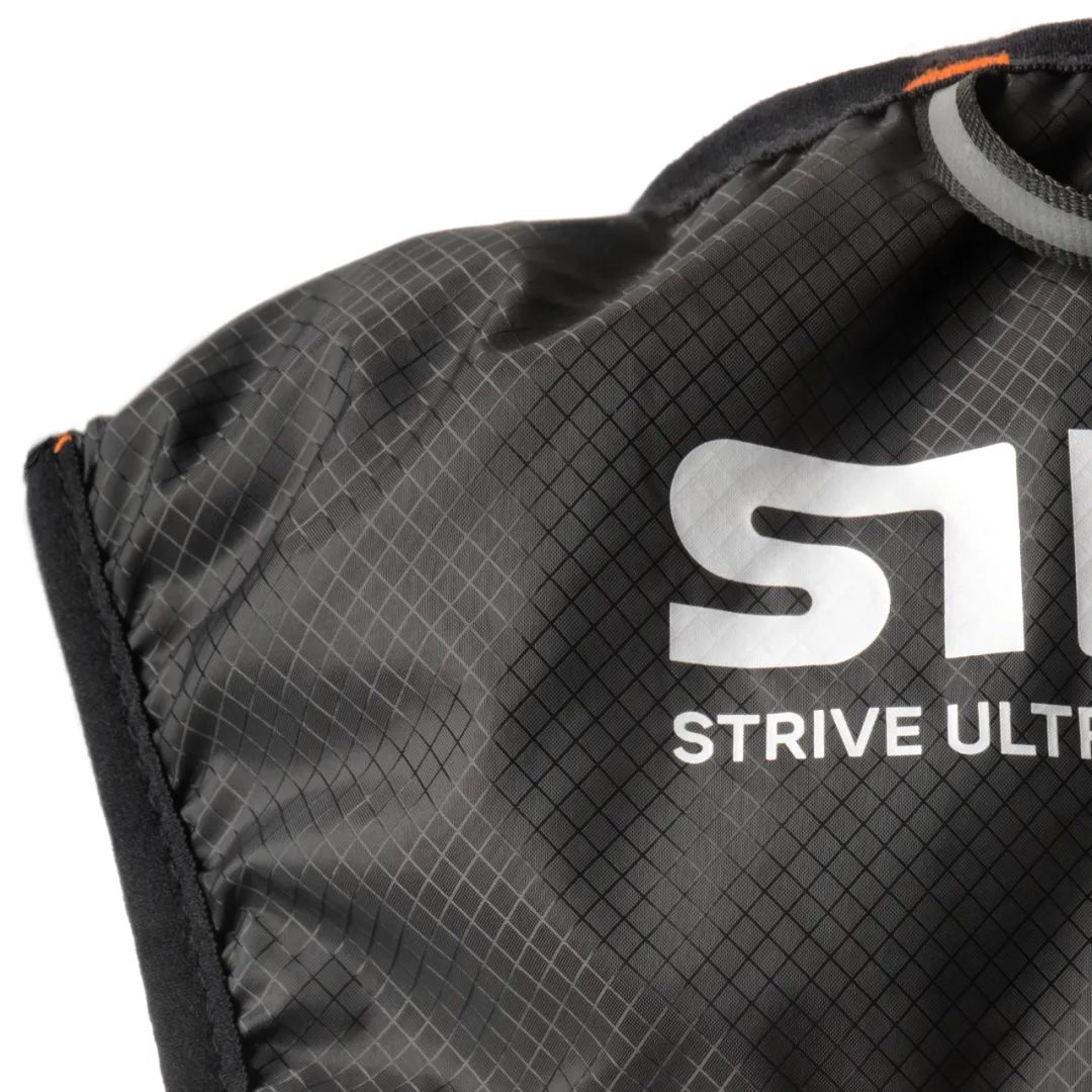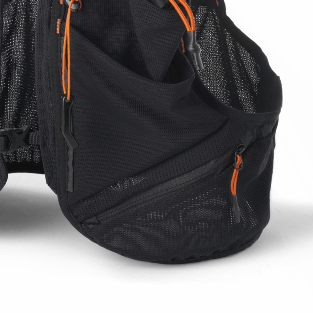 包身前侧的两个加大水壶袋,可分别装载一个500毫升软水壶,自带调节抽绳,即便高速奔跑也不易晃动与脱落。