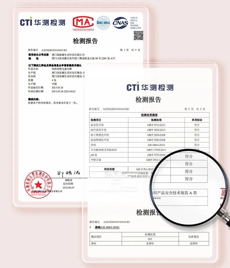 孩童的肌肤相对比较娇嫩敏感,一次性内裤又是直接与肌肤接触,所以在面料选择上宝妈们一定要擦亮眼睛,纯棉材质是基本要求。根据《国家纺织产品基本安全技术规范》对纺织产品的甲醛含量、PH值、色牢度、可分解芳香胺染料等方面,规定了强制性安全指标考核要求,称为“安全技术检测类别”,其分为三个等级,A类是婴幼儿用品,B类是直接与皮肤接触的产品,C类是间接与皮肤接触的产品。