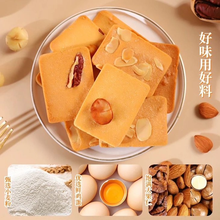 4、升级版新口味坚果烘焙糕点,有夏威夷果,碧根果,杏仁,3种新口味坚果芙,一箱42包左右,平均一片还不到5毛钱,更划算!