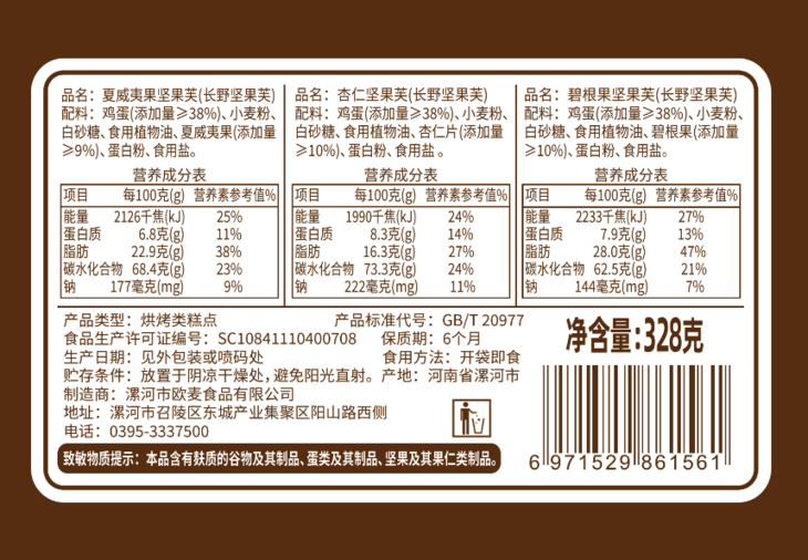 6、优选食材,不含添加剂,配料表一目了然。鸡蛋含量高达38%,夏威夷果添加量9%,碧根果添加量10%,杏仁添加量10%,黄金膳食配比,真正的营养美味,老人小孩都能吃!