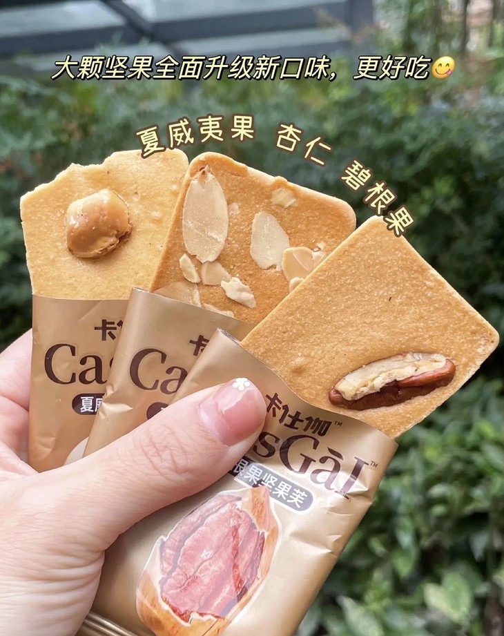 升级版新口味坚果烘焙糕点,有夏威夷果,碧根果,杏仁3种新口味坚果芙,一箱42包左右,平均一片还不到5毛钱,超划算!