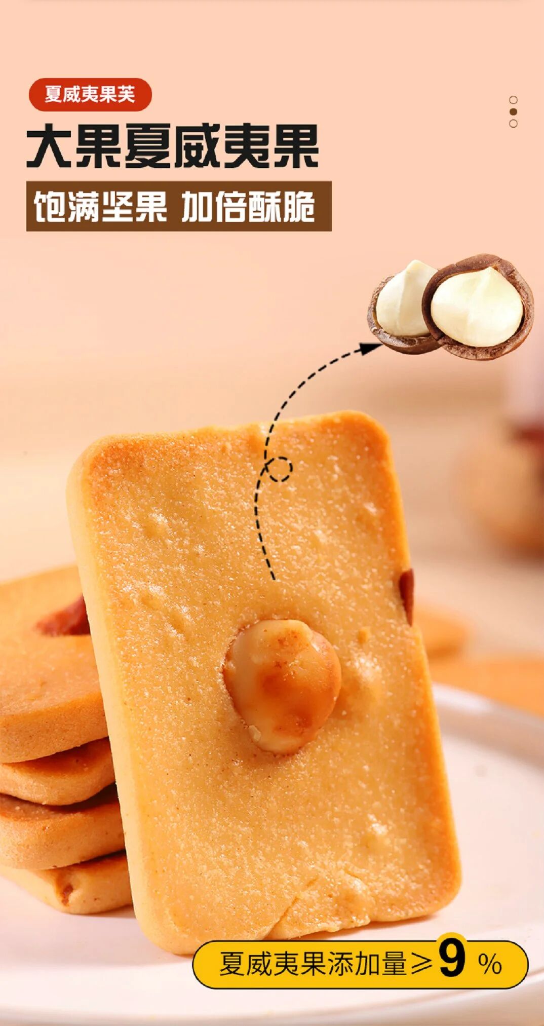 夏威夷果添加量9%,碧根果添加量10%,杏仁添加量10%,膳食配比均衡,每个饼干上都有一个坚果,好像小时候吃的味道,低温烘焙,非油炸制作,不易上火