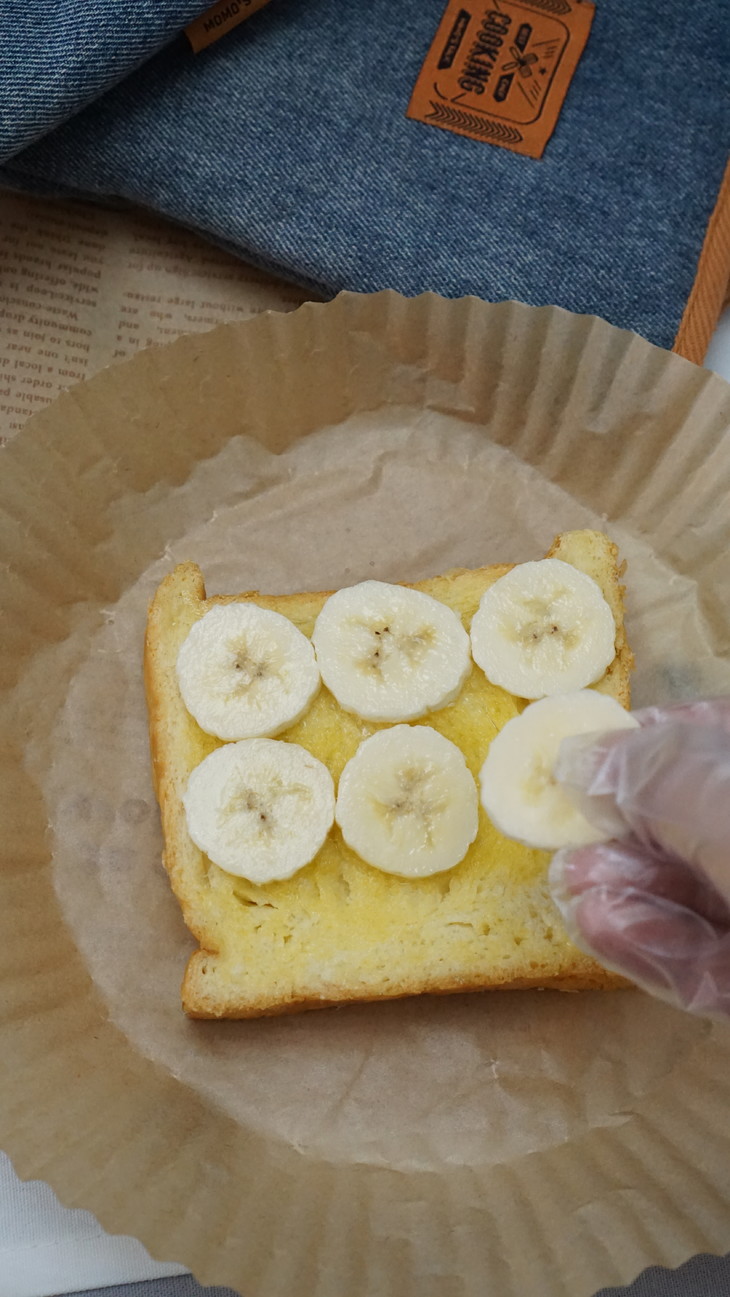 3.把香蕉切片后平铺在吐司上,撒一层白砂糖 (芝士爱好者可以撒上一层马苏里拉芝士)