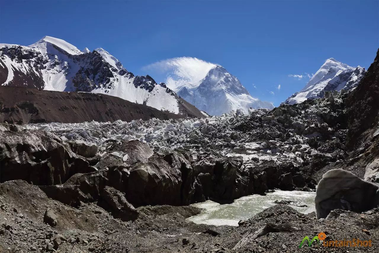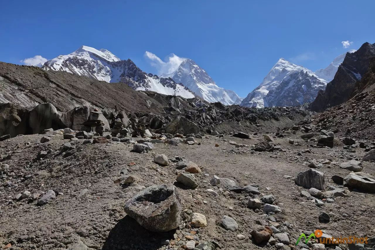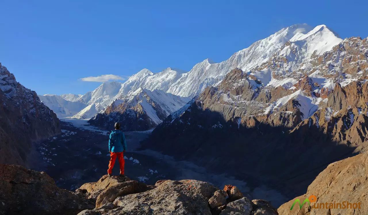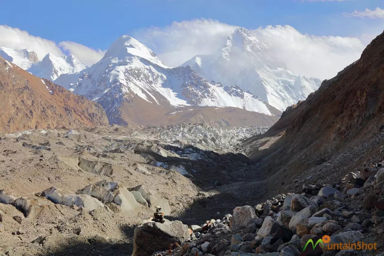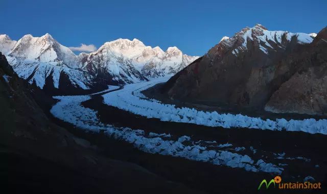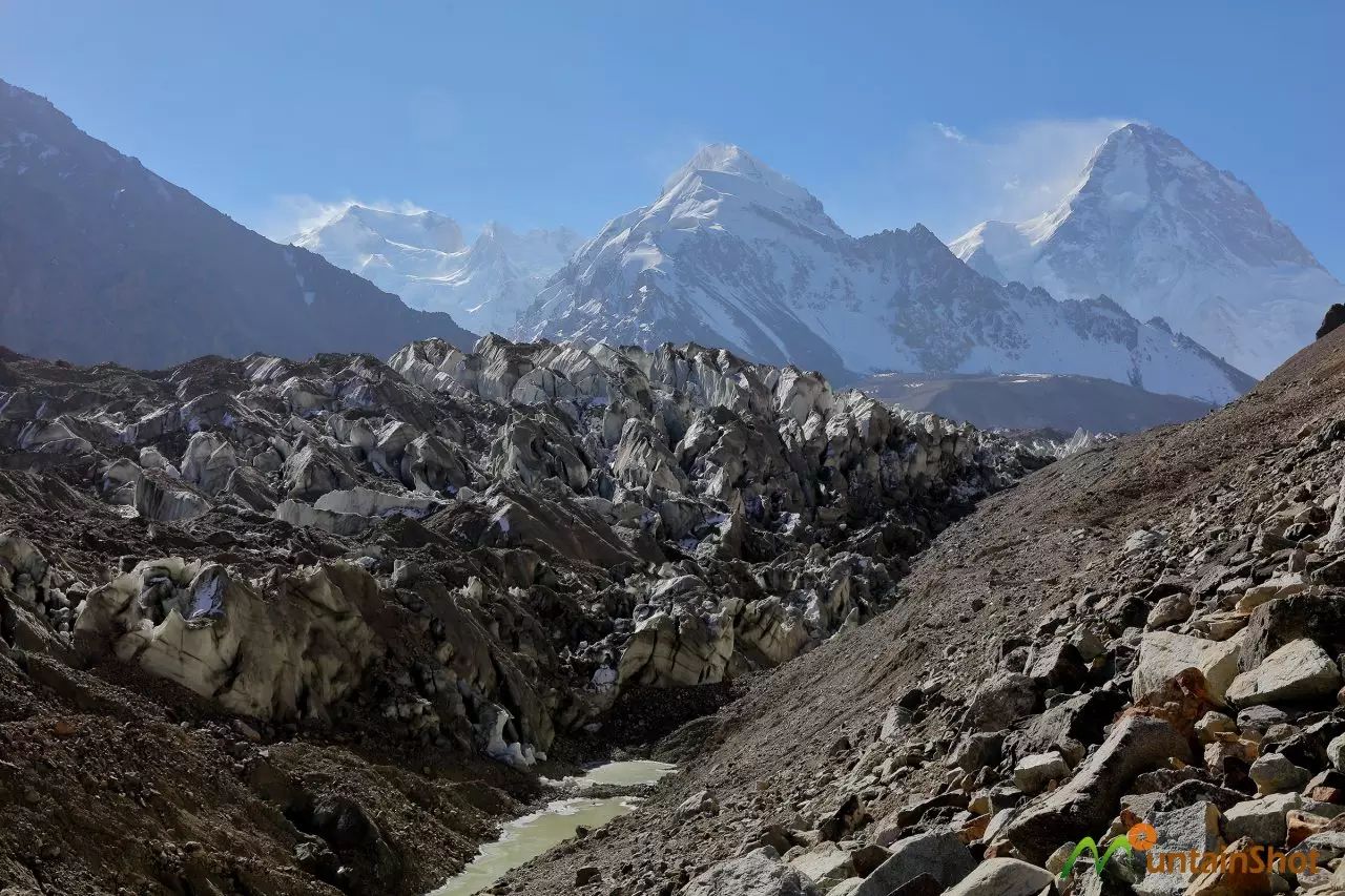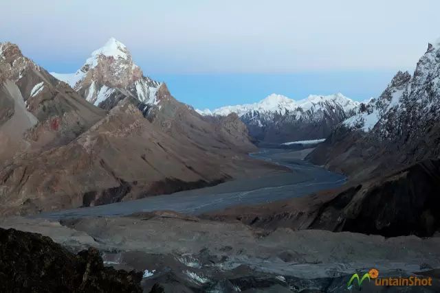 站在观景平台上,最引人注目的当属右侧的布洛阿特峰和蜿蜒洁白的迦舒布鲁姆冰川。我们可以很清楚的看到冰川的主体其实发源于布洛阿特峰,源于迦舒布鲁姆的冰川与之相比弱小很多,所以这个冰川的命名值得商榷。