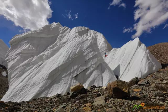 3.9 乌杜鲁克营地:迦舒布鲁姆营地的缺憾是看不到布洛阿特峰,因此需要前往距离不远处的乌杜鲁克营地。沿迦舒布鲁姆冰川末端冰墙前行,风景无限变化多端,建议且走且玩。其实这个冰墙下也是拍摄迦舒布鲁姆日照金山的绝佳地点,但看不到K2。