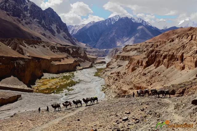 d,克勒青河谷路线漫长,总长超过300公里,有多处地点需要穿越冰冷刺骨的急流,因此需要驼队运输物资并在必要时运送队员渡河;