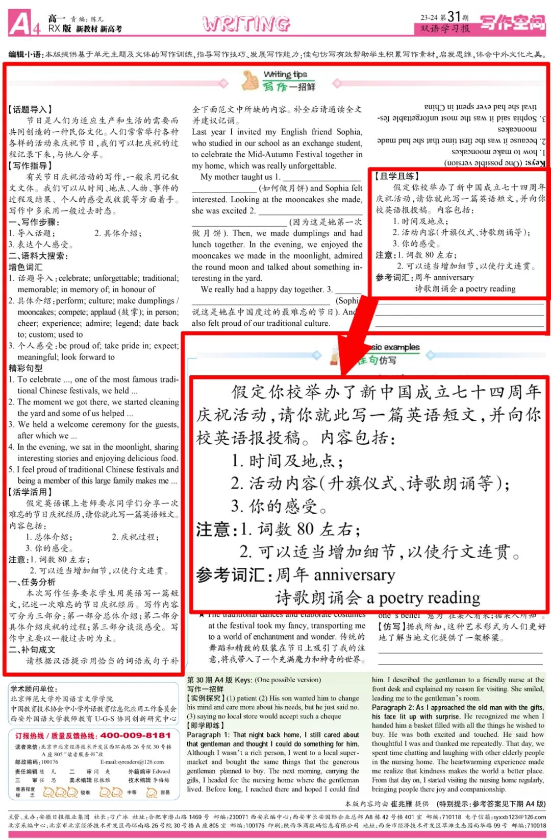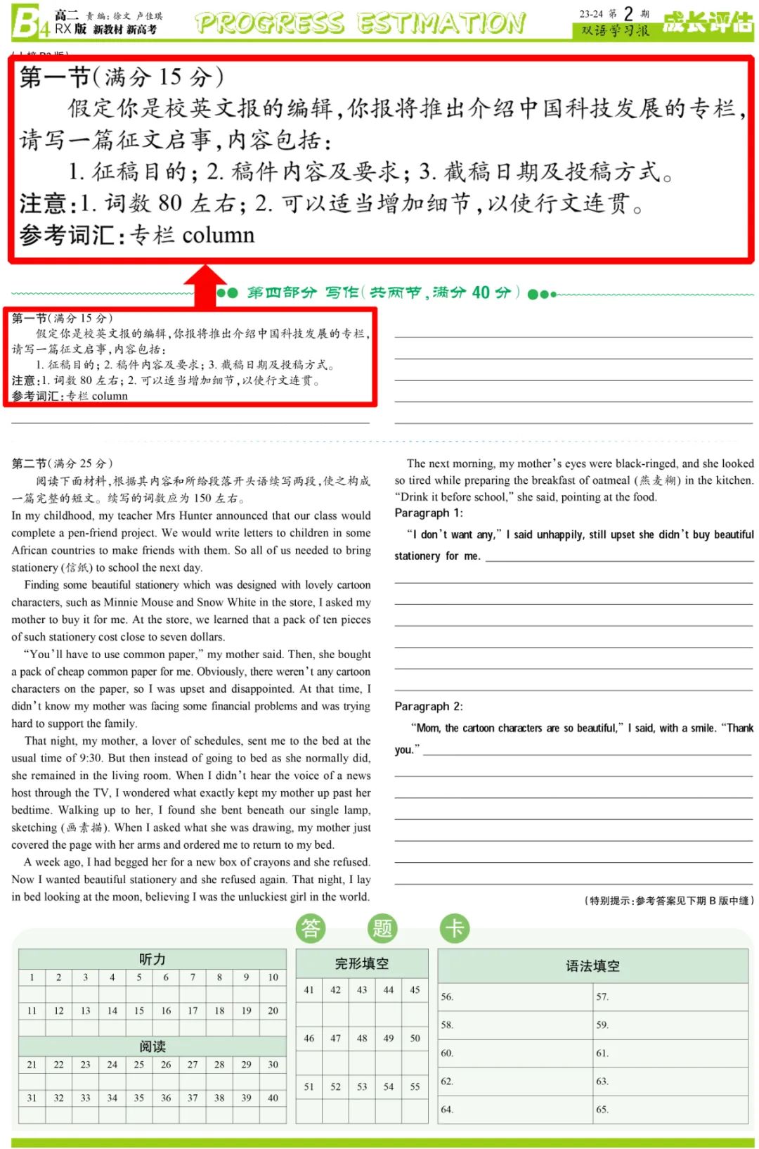 《双语学习报》2023-2024学年高二RX版新教材新高考第2期B4版应用文写作和2024年甲卷书面表达主题一致