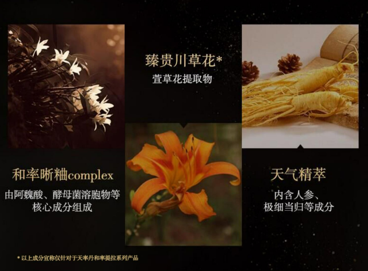 川草花:一年仅花开一次,品牌从中筛选并萃取出有效成分加入到天率丹中,能够帮助肌肤摆脱暗沉、再现润泽光采。