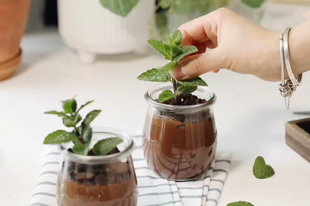 4. 取出后撒上奥利奥碎,插上薄荷叶装饰即可。