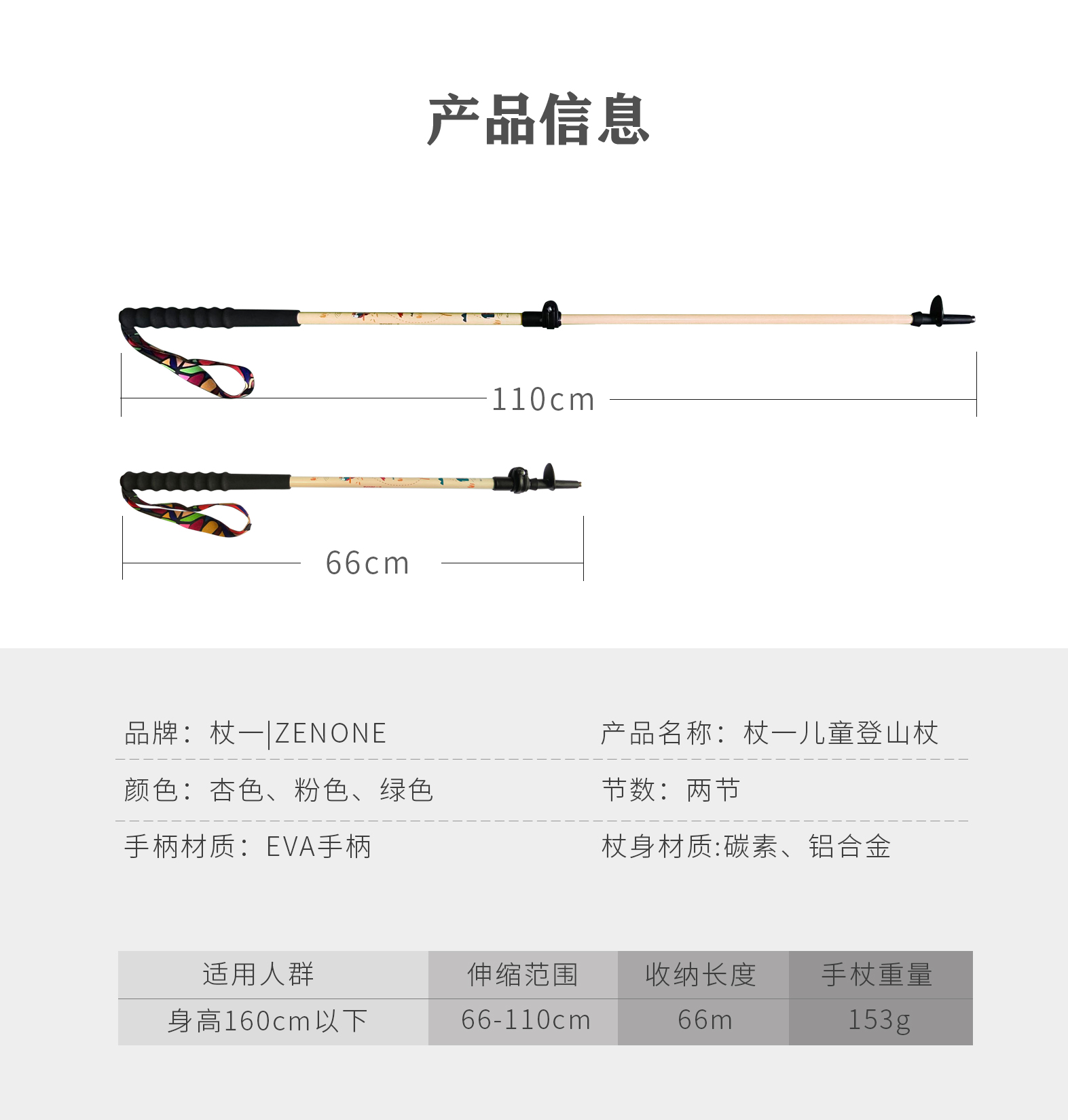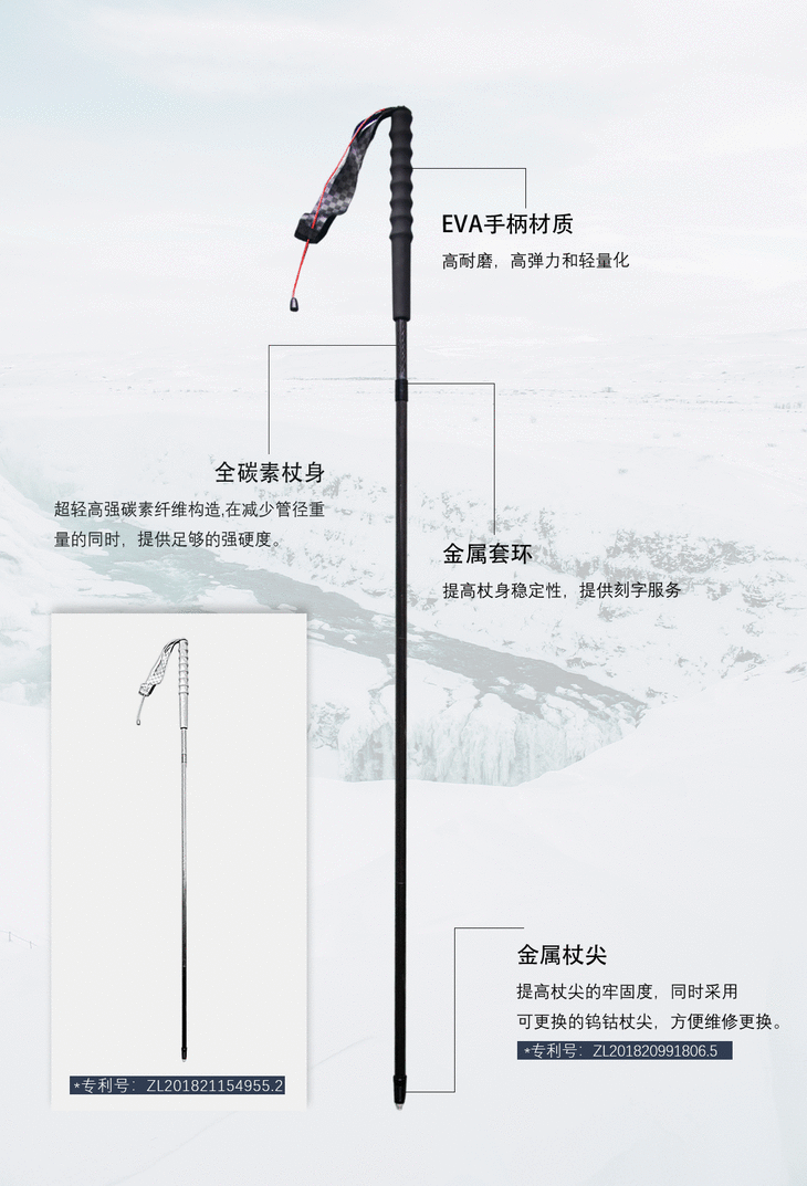 全身高强碳素纤维构造,硬 度强又超轻!单支只有 99 克!四节折叠设计,收纳后仅 33 厘米!比 A4 纸长 3 零米左右,可轻松放进 20 升背包,携带无负担,懒人收纳必备!采用大力马拉绳、ZEN3 专利一体杖尖、EVA 手柄!耐用耐磨,使用寿命大大延长!