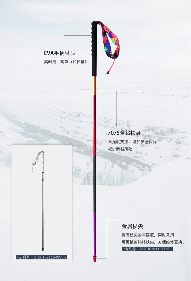 杖一所有产品中性价比最高的一款,采用航空级别 7075 铝合金材质,由于铝合金材质的稳定性,所以强度更大,有效减少断裂风险,虽然是铝合金材质,但是重量也控制到了惊人的 127g(100cm),因此无论是越野跑还是徒步,这款手杖都十分合适!小白闭眼入~!