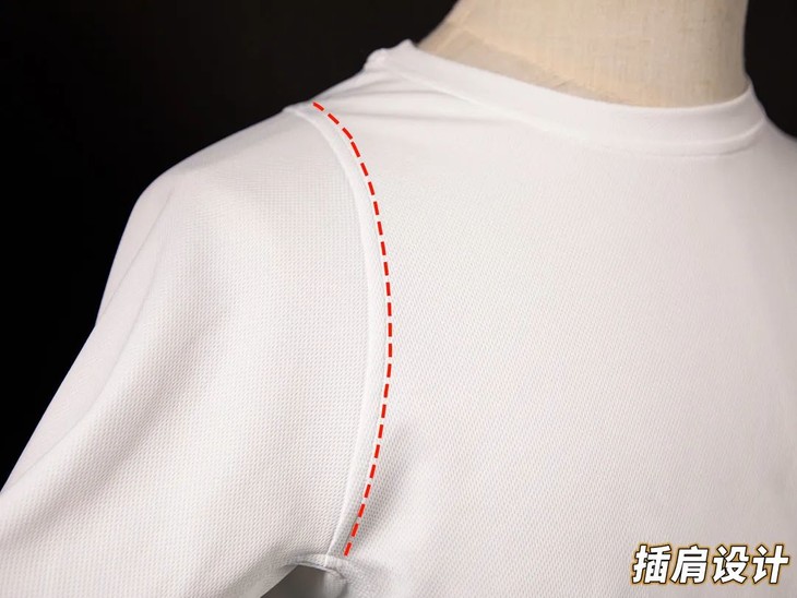 让我们再来看一下,这件T恤身上的亮点,圆领设计,开创白T“背背佳”式设计、独创月牙形弧面缝合。