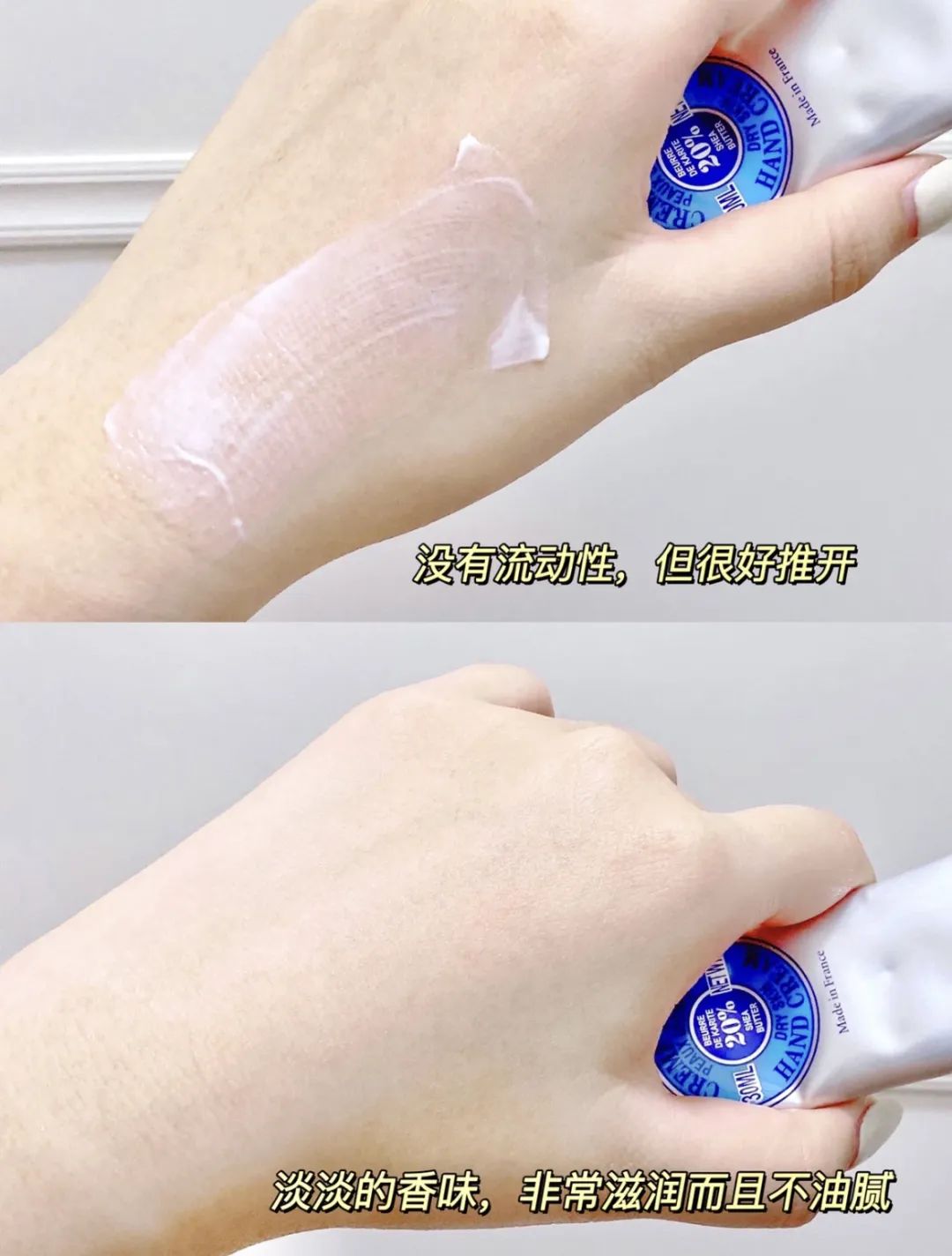 欧舒丹护手霜的肤感很好,质地水润,不油腻不假滑,一年四季都能用。