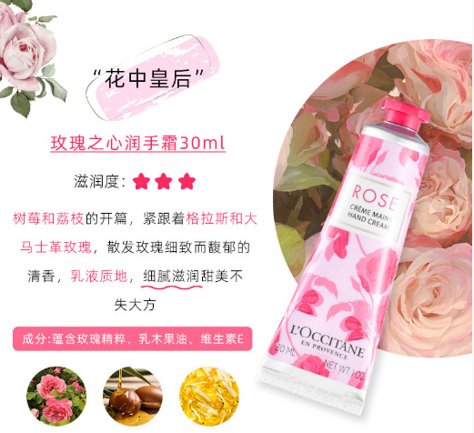玫瑰花香交织,散发温柔高贵魅力,滋养柔软双手,保湿补水双手细致如初。