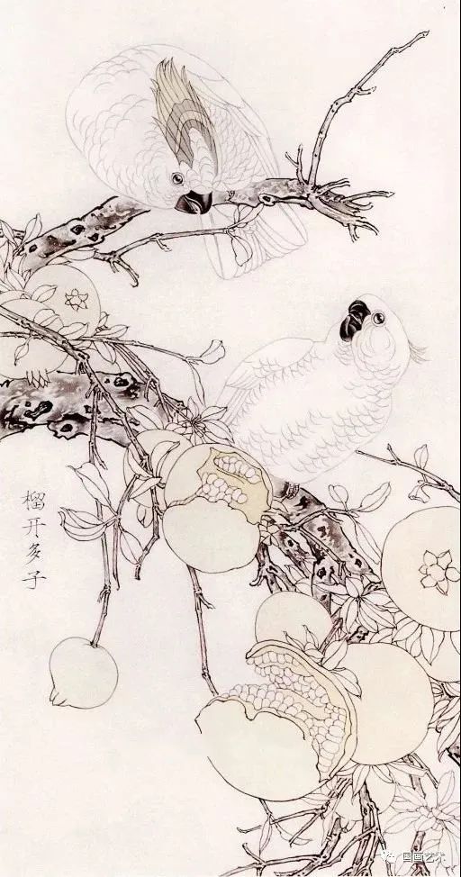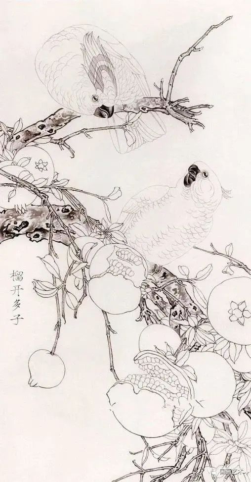 步骤一:用浓淡墨勾皴出枝干,用重墨勾叶子以及鸟嘴和爪,中墨勾石榴,淡墨勾鸟身、羽毛等部位。