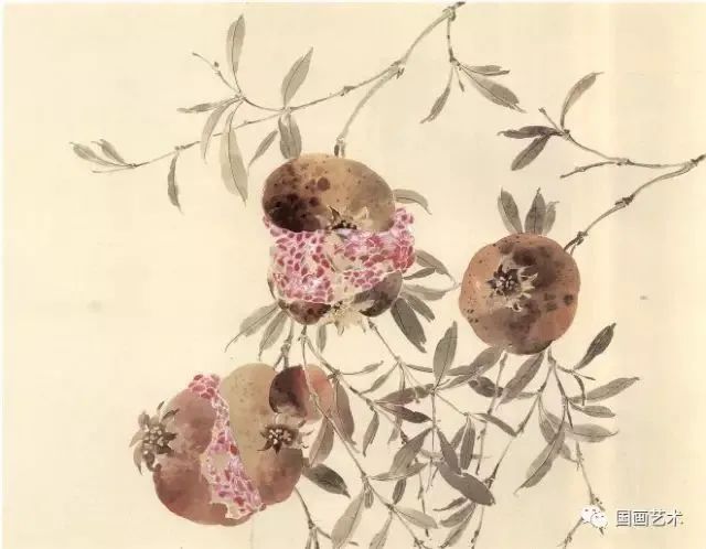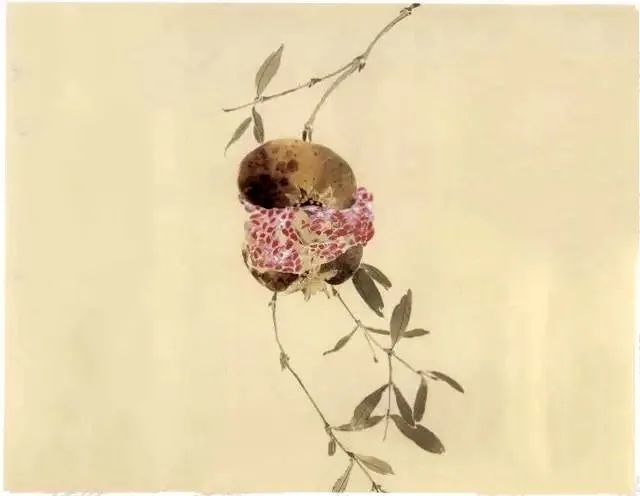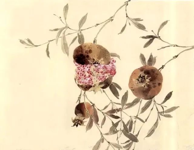 步骤一:石榴是具有美好寓意的蔬果,古今画家多有表现,但以没骨法写生者不多,此幅《榴开百子》是一幅写生作品,有实物的参照。没骨花卉蔬果不能仅仅是一种技法的表现,其精髓在于写生和对自然的观察和体悟,而非固定的程式表现。