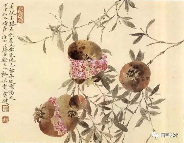 步骤二:在面对自然的时候,一定要进行主观的处理,以审美的眼光取舍自然,在客观的物象中发现有形式意味的东西。石榴的颜色以墨、胭脂、藤黄、赭石等调和,根据不同色彩变化而表现。枝叶以淡墨和淡赭为主,先点染其形态,然后再以墨线勾叶筋。