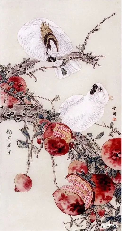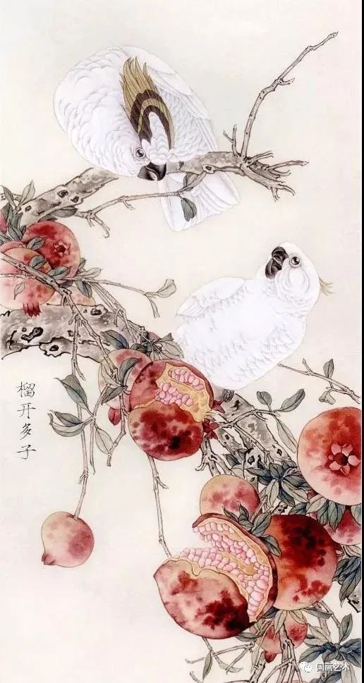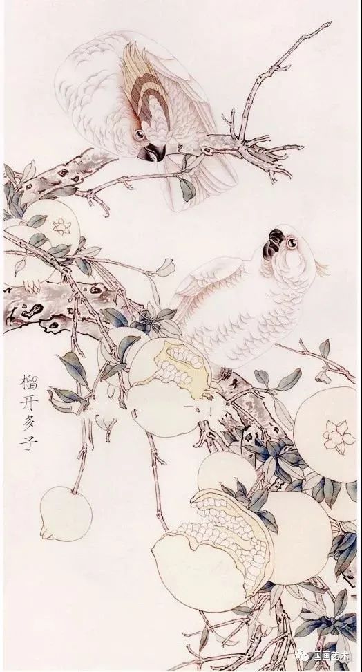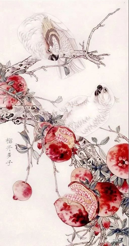 步骤四:石榴用胭脂、曙红加花青和用曙红、朱磦加赭石碰染,注意要有干湿变化,染出鲜嫩的质感。继续加深冠羽的颜色后,用白粉提亮鸟的高光处。