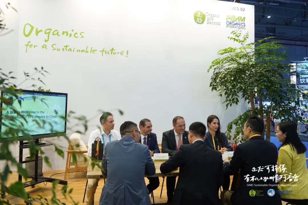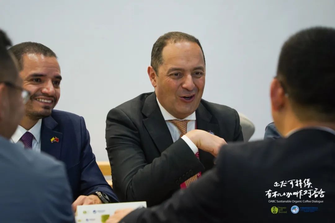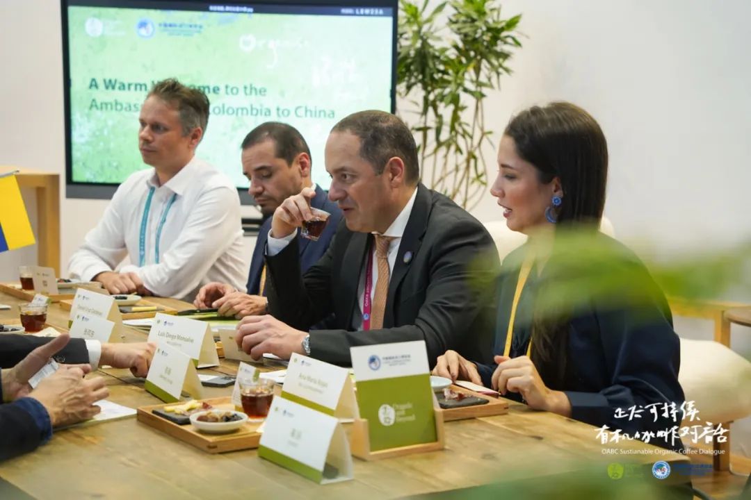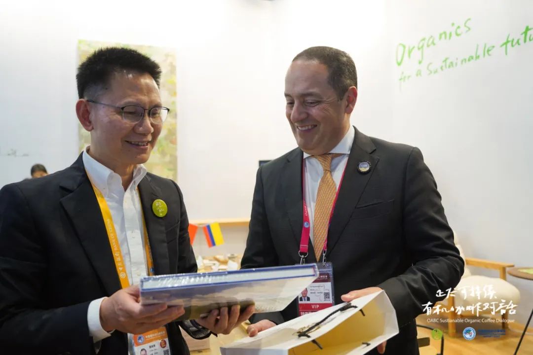 11月7日,第四届中国国际进口博览会,张向东对话哥伦比亚共和国驻华大使路易斯·迭戈·蒙萨尔韦(Luis Diego Monsalve),以可持续有机咖啡联结世界。