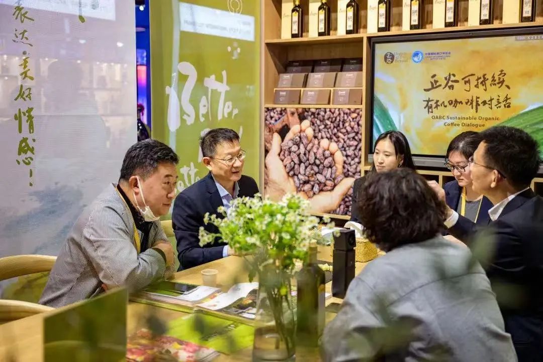 2020年11月,进博会,正谷与坦桑尼亚大使姆贝尔瓦·凯鲁基、印度尼西亚共和国驻华大使周浩黎、埃塞俄比亚联邦民主共和国驻华大使馆公使盖布鲁·阿莱穆、中国食品土畜进出口商会曹德荣会长交流探讨有机咖啡在中国市场的机会。中国有机产品认证工作组专家、正谷联合创始人张友廷对全球有机咖啡生产与消费概况进行了讲演汇报。