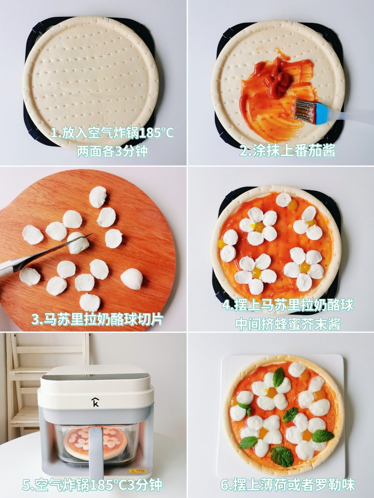 1、披萨饼底提前解冻,放入空气炸锅185℃正反面各烤三分钟
