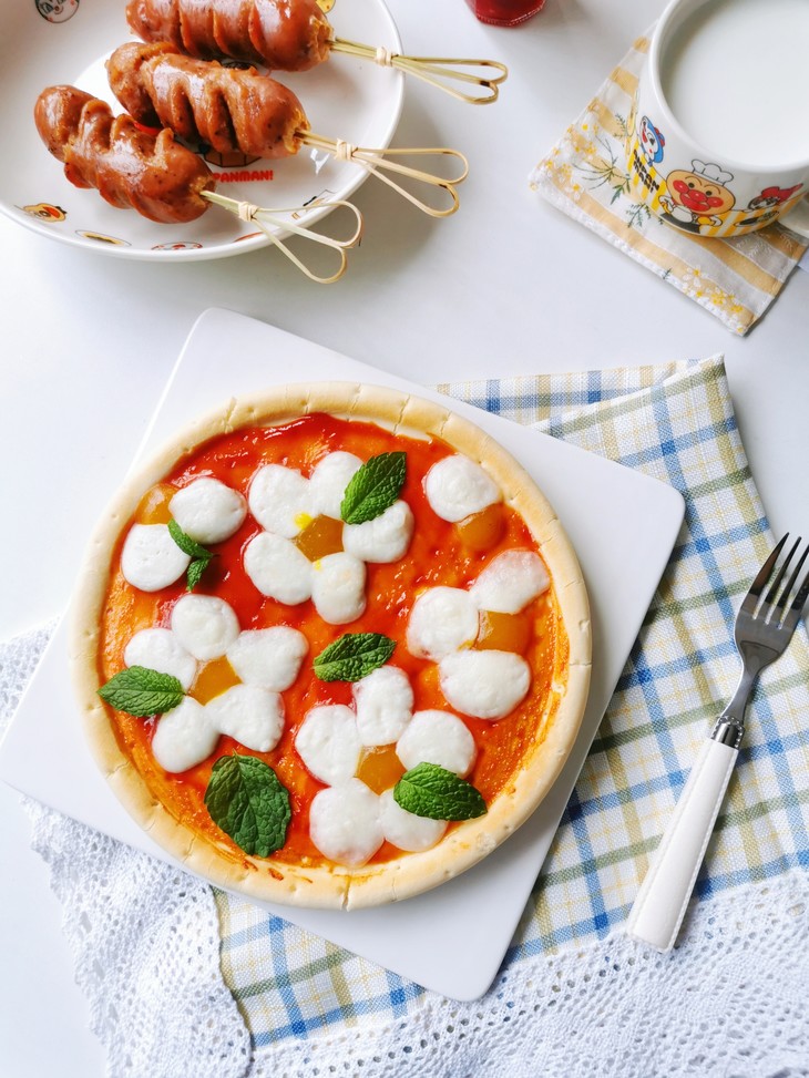 2、烤好的披萨饼上刷满番茄酱,摆上切好的马苏里拉奶酪球,中间挤蜂蜜芥末酱,185℃烤3分钟