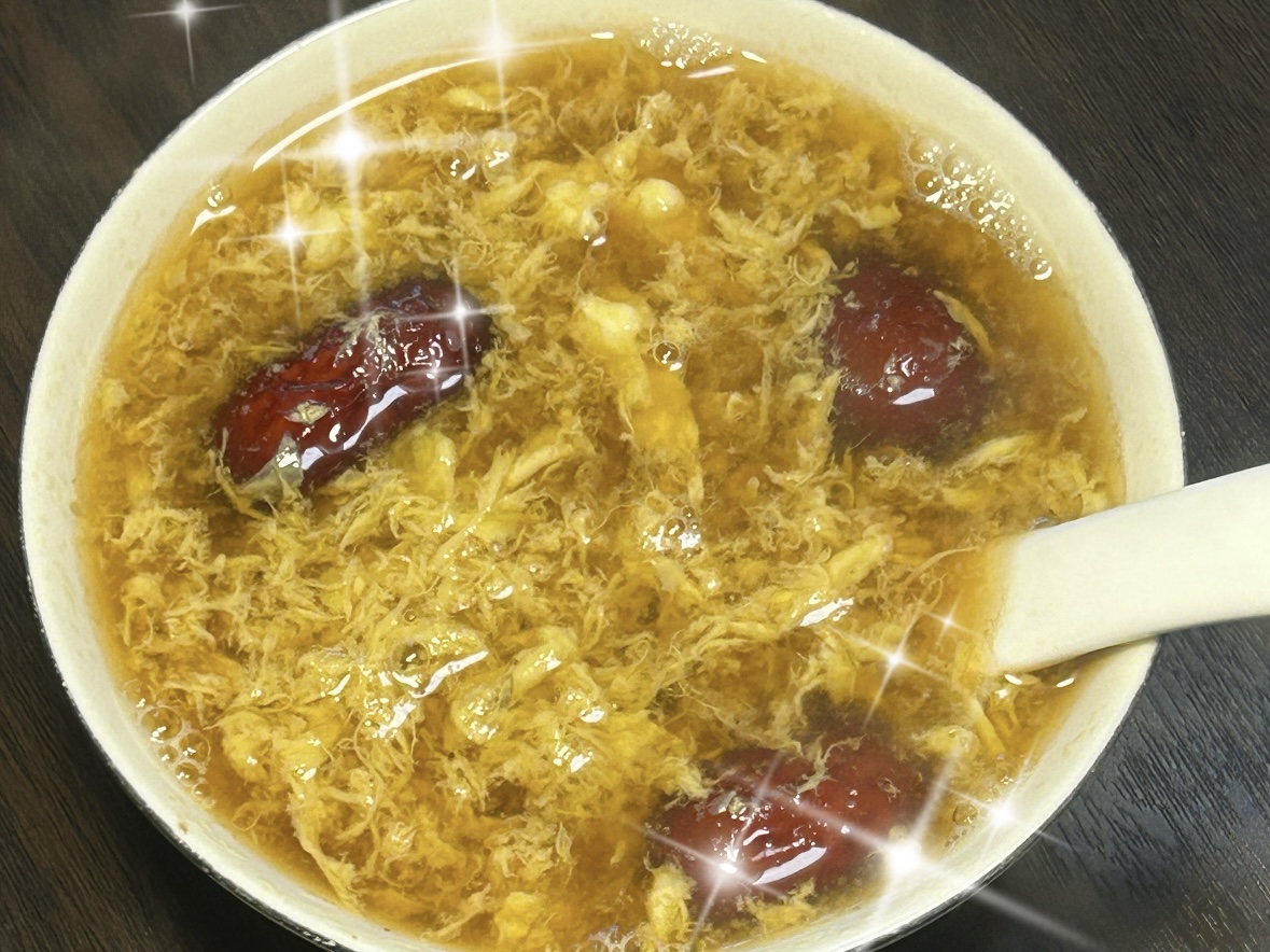 锅中烧开一小碗水煮红枣,冲入鸡蛋液形成蛋花,关火。