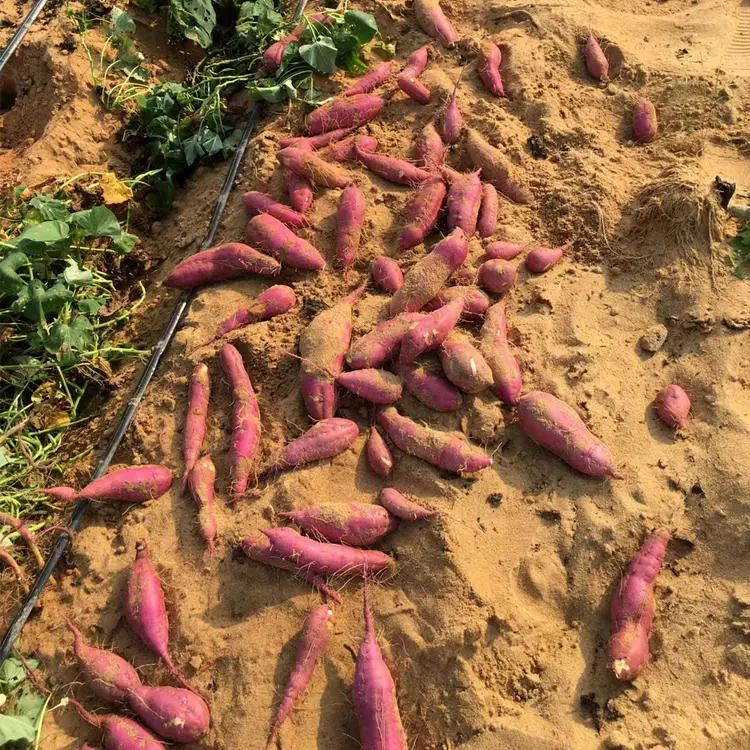 沙土松散酥软,不用锄头,只需用手轻轻一拔地瓜蔓,一串粉红皮的地瓜轻松“面世”。
